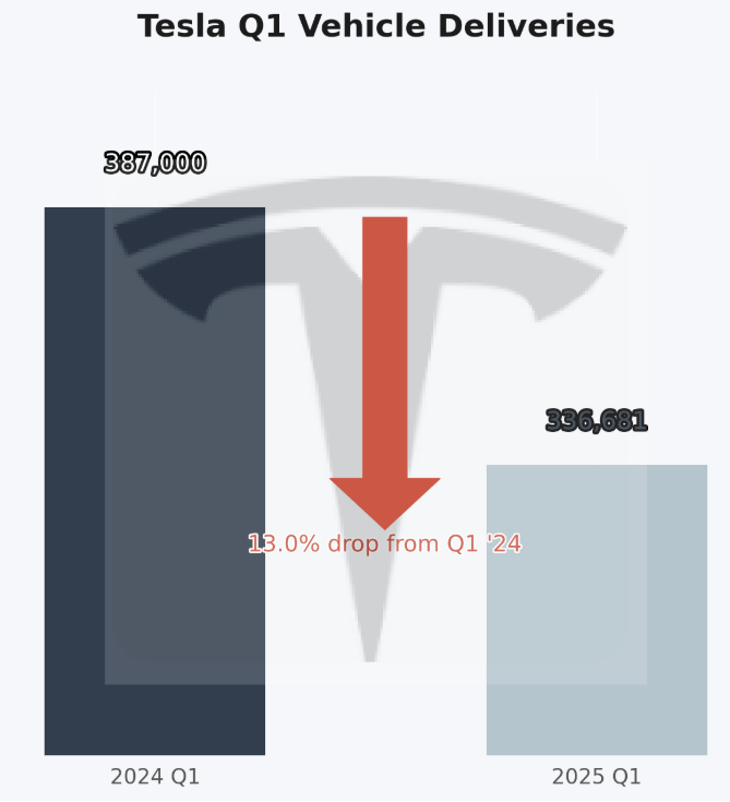 Tesla reported a 13% drop in vehicle deliveries for Q1 2025, totaling 336,681 units—significantly below Wall Street expectations. This led to a 6.1% decline in Tesla’s stock price, with growing backlash over Elon Musk’s political activities cited as a contributing factor.